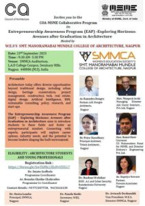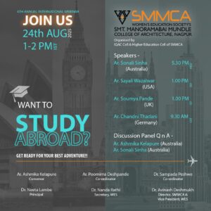 Smt Manoramabai Mundle College of Architecture offers a five year degree course in Architecture (B.Arch), two year post graduate course (M.Arch in Architecture Education and Urban Planning) and Ph.D. in architecture.