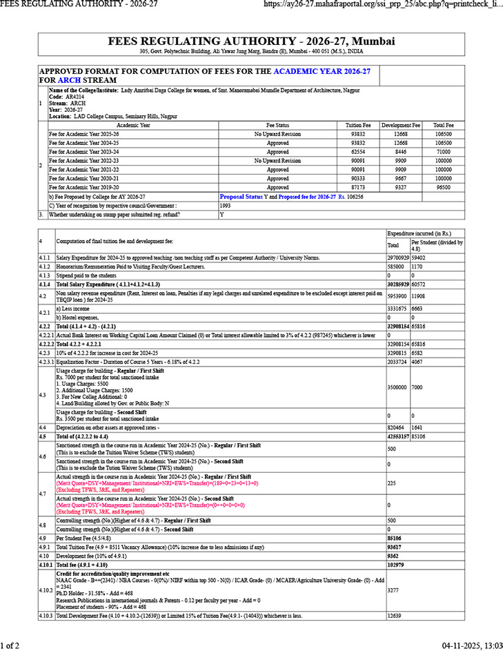Smt Manoramabai Mundle College of Architecture was the Department of Architecture of LAD College started in the session 1993-94 and was elevated to the status of a college in 2008-09 after permission granted by the Council of Architecture, New Delhi and Government of Maharashtra.
